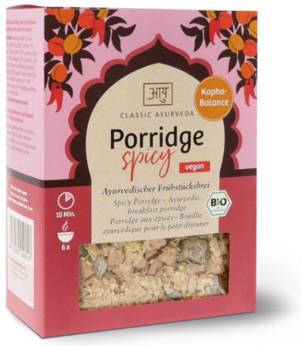 This porridge provides a base for a light, warm breakfast in accordance with Ayurvedic tradition. The mixture of millet, rice and quinoa flakes is complemented by the sweetness of apricots, dates, apples and mango. Ayurvedic spices such as ginger, pippali, black pepper and chilli provide a finely tuned heat, rounded off by turmeric, Ceylon cinnamon and ashwagandha. The recipe contains no added refined sugar and is ideal for the Kapha type.
