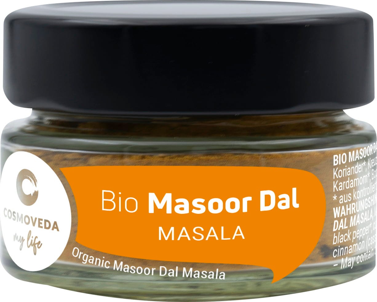 COSMOVEDA Organic Masoor Dal Masala, a specially formulated Ayurvedic blend of fine spicesfor simply delicious and easily digestible Masoor Dal.