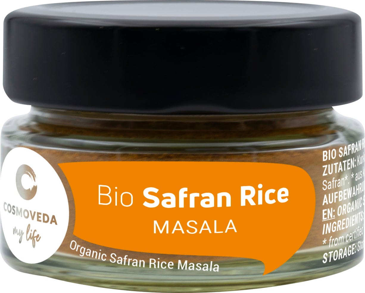 COSMOVEDA Organic Saffron Rice Masala, a specially formulated Ayurvedic blend of fine spices to conjure up a delicious saffron rice. Add a pinch of masala to the boiling water, or gently fry the masala in sunflower oil or ghee before cooking, add and stir the rice until it is covered with the colour of spices and cooking in hot water.