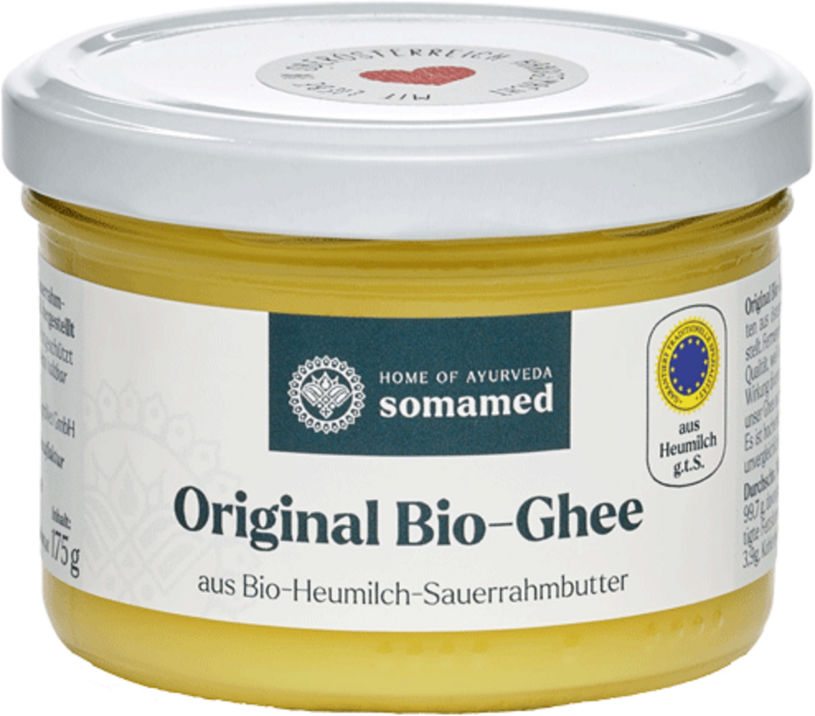 The Organic Ayurveda Ghee is handmade in Upper Austria from the finest Austrian sour cream butter in organic quality. This process which is very complex and time-consuming guarantees a long shelf life and also contributes to the extremely high quality of the ghee. Vitamins, A, D, E and K are retained and the taste is greatly intensified. The golden yellow colour is also an indication of its impeccable quality. Ghee has a particularly long tradition in Ayurveda and is still in use every day even today - in the kitchen, during Rasayana cures or as an ingredient for healing purposes. Ghee is particularly useful while cooking because it has a very high smoking point and therefore does not oxidise when heated.