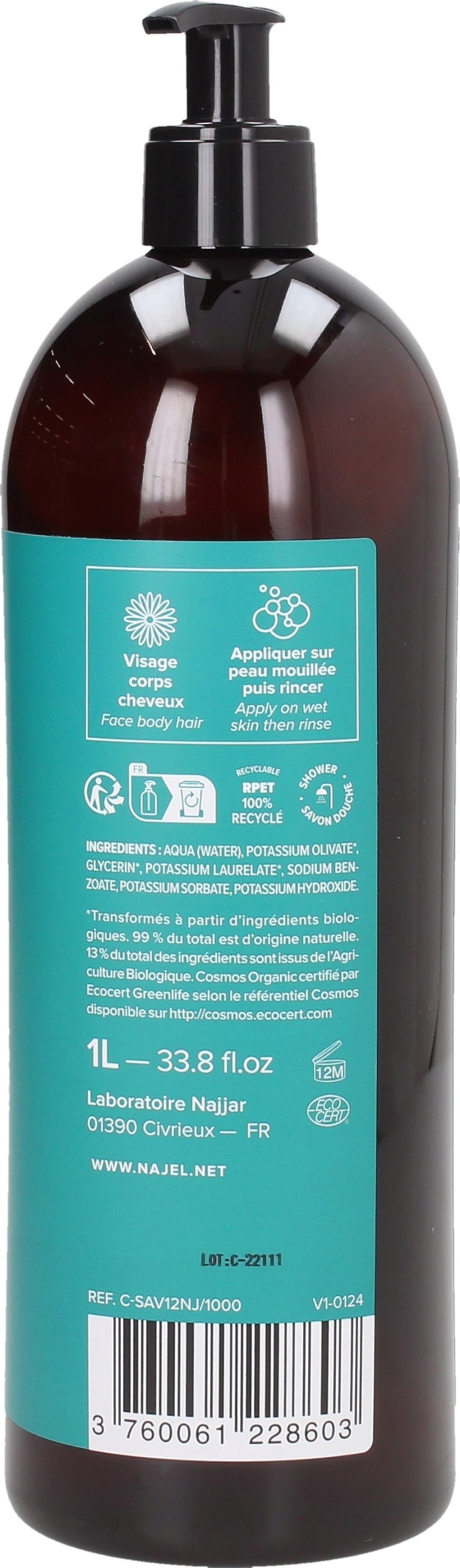 Discover the genuine Aleppo soap in liquid form, which is also suitable for dry, sensitive and irritated skin. It is an authentic product that is famous all over the world. Najel produces it exclusively with organic olive oil and organic laurel berry oil to deliver a natural product of outstanding quality. Discover all the craftsmanship of the Syrian master soap makers with this Aleppo soap.