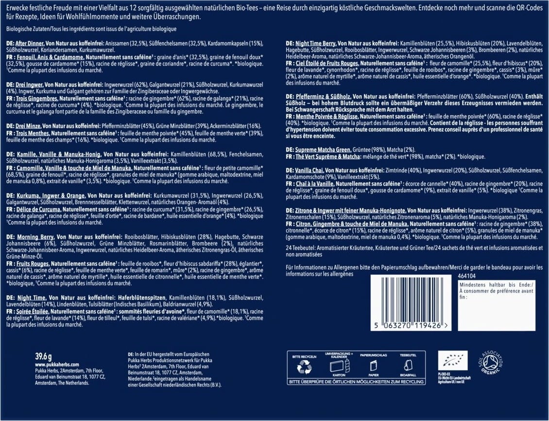 | Manufacturer: | Lipton Teas and Infusions Germany GmbH, Axel-Springer-Platz 3, c/o WeWork, 20355, Hamburg, Germany, kontakt@pukkaherbs.de |